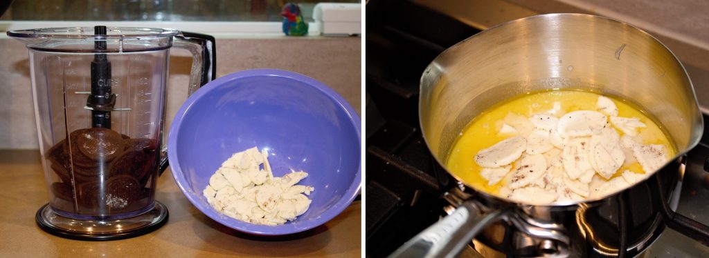 1. Twist apart the Oreos and scrape the filling into a medium bowl and place the cookies in a food processor.